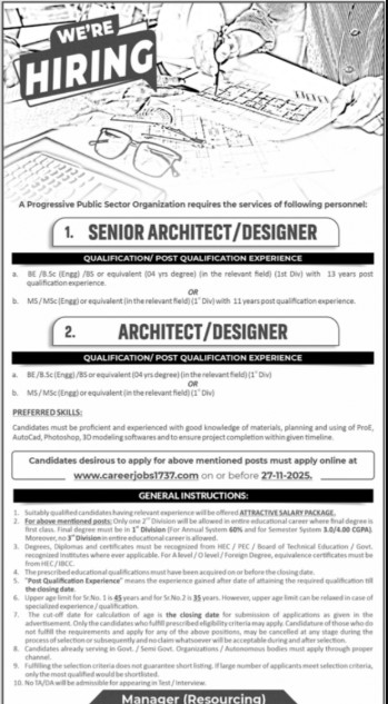 Candidates if you are seeking A Progressive Public Sector Organization Jobs In Islamabad November 2025 if yes. It would be best if you tried to complete read A Progressive Public Sector Organization job because you can easily apply for these vacanciesm SENIOR ARCHITECT/DESIGNER. Only male candidates can apply for A Progressive Public Sector Organization Jobs In Islamabad November 2025 Qualification /Experience Required: BE/B.Sc (Engg) /85 or equivalent (04 yrs degree) (in the relevant field) (1st Div) with 13 years post qualification experience.OR MS/MSc (Eng) or equivalent (in the relevant field) (1″ Div) with 11 years post qualification experience, and more experienced candidates should apply before 27November 2025.