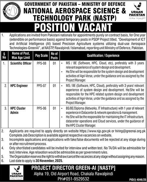 Only male candidates can apply for National Aerospace Science Technology Jobs In Rawalpindi November 2025 Qualification /Experience Required:MS/BE (Software, HPC, Cloud, etc), preferably with 3 years relevant experience of system design and development.He/She will be responsible for the system design and development activities of Agri-Verse, under the guidance and as assigned by the Project Manager, and more experienced candidates should apply before 30 November 2025.