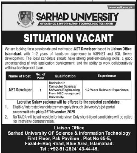 Candidates if you are seeking Sarhad University And Information Technology Jobs In Peshawar November 2025 if yes. It would be best if you tried to complete read University And Information Technology job because you can easily apply for these vacancies NET Developer.