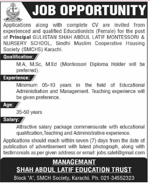 Only male candidates can apply for Shah Abdul Latif Education Trust Jobs In Karachi November 2025 Qualification /Experience Required:M.A, M.Sc, M.Ed (Montessori Diploma Holder will be preferred)perience:Minimum 05-10 years in the field of Educational Administration and Management. Teaching experience will be given preference, and more experienced candidates should apply before 23 November 2025.