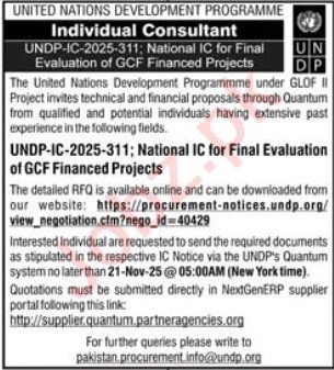 Only male candidates can apply for United Nations Development Programme Jobs In Karachi November 2025 Qualification /Experience Required:The United Nations Development Programmme under GLOF II Project invites technical and financial proposals through Quantum from qualified and potential individuals having extensive past experience in the following fields UNDP-IC-2025-311; National IC for Final Evaluation of GCF Financed Projects and more experienced candidates should apply before 21 November 2025.